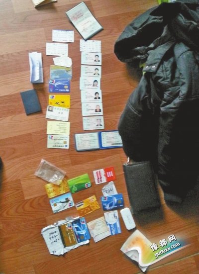 民警从嫌疑人家中搜到的准备再次作案用的身份证等。