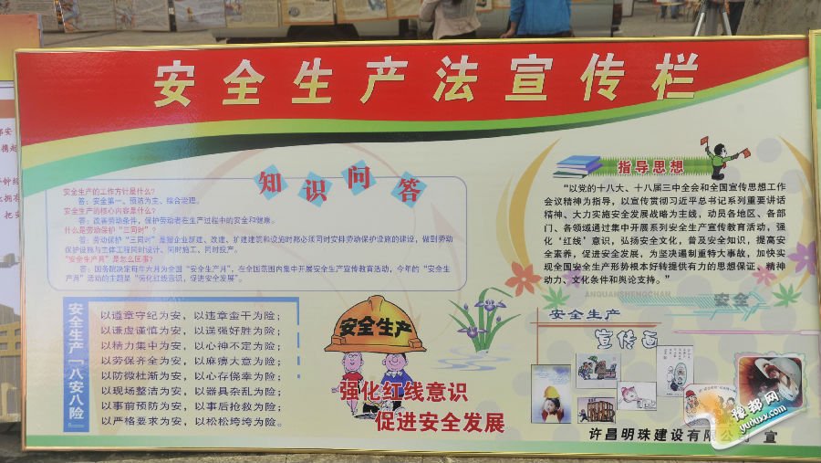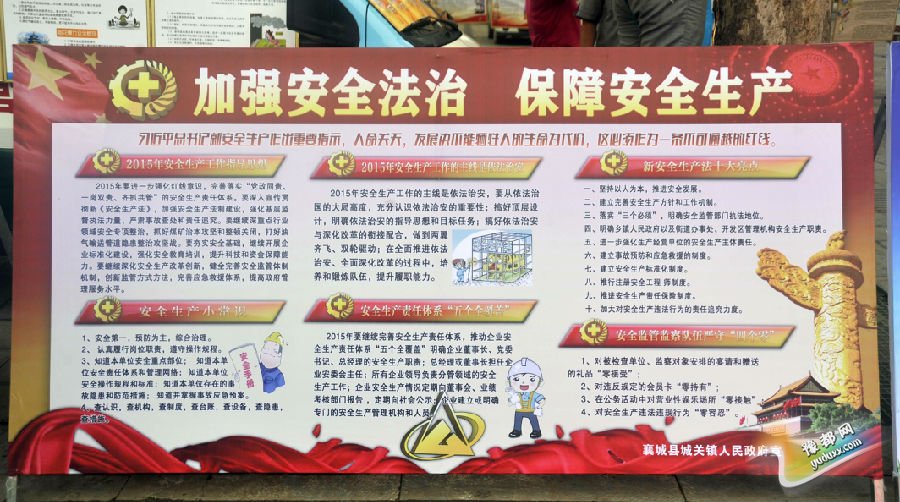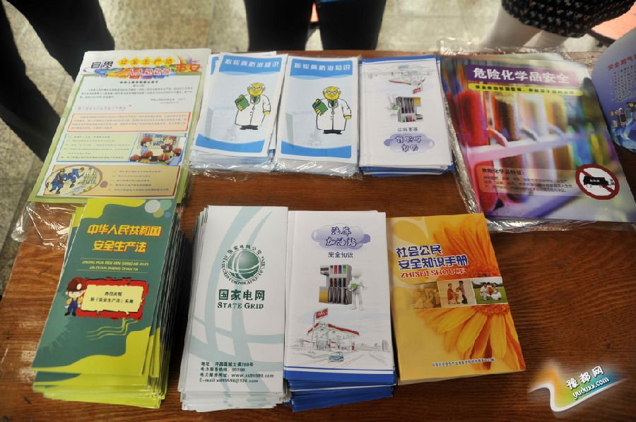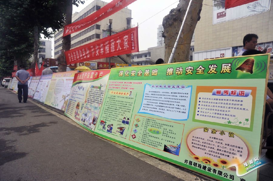 襄城县以“安全生产月”为契机,紧紧围绕“加强安全法治,保障安全生产”这一活动主题,在县一峰城市广场开展了“安全生产月”宣传咨询日活动。县安全监管局、住建局、教体局、公安局、质监局、交通运输局、供电公司和县首山焦化、河南万杰等43家企事业单位在活动现场悬挂安全生产宣传横幅,摆放150余块安全法律法规、消防安全知识、交通安全常识等宣传展板。